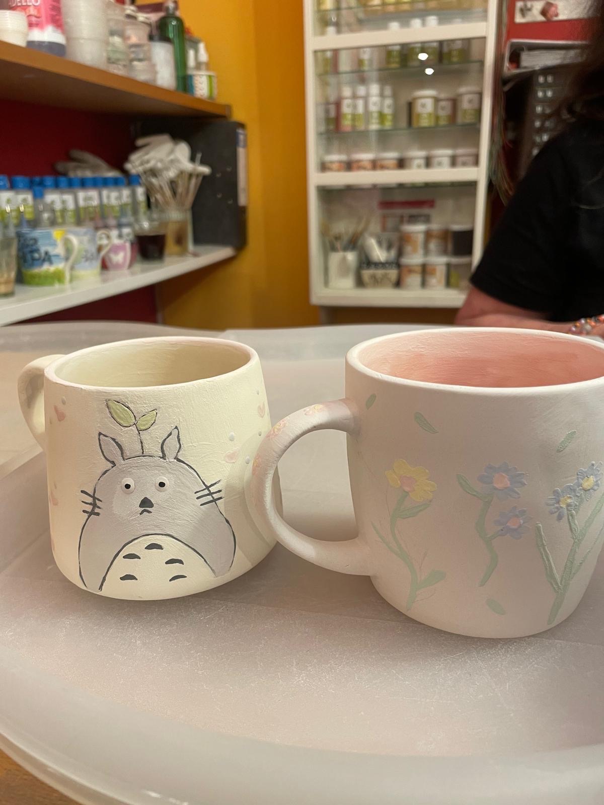 The store was warm and slightly crowded, with people already settled into their chairs, ceramic pieces in front of them, palettes of pastel paints scattered across the tables. Maya chose to paint Totoro, while I chose floral designs.